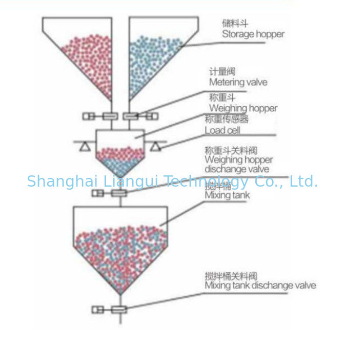 Το βαρυμετρικό μπλέντερ μπορεί να τοποθετηθεί στο υποστήριγμα επάνω από τη μηχανή, μπορεί επίσης να τοποθετηθεί στη στάση πατωμάτων εκτός από τη μηχανή, με τα κενά autoloaders για να μεταφέρει τις πρώτες ύλες στη μηχανή σχηματοποίησης εγχύσεων. Το ζύγισμα των πρώτων υλών μπορεί να ολοκληρωθεί από την πνευματική βαλβίδα μόνο ή να συνδυαστεί με την μικροϋπολογιστής-σίτιση της συσκευής (προαιρετικής). Κάθε ακατέργαστος magterial στέλνεται άμεσα στο ζυγίζοντας πιάτο που αποτελείται από ένα μεγάλης ακρίβειας loadcell. Όταν όλες οι πρώτες ύλες ζυγίζονται κατάλληλα και μετριούνται, ολόκληρη η batch πρώτων υλών θα σταλεί στη δεξαμενή μίξης για τη μίξη. Το μπλέντερ υψηλής αποδοτικότητας θα αναμίξει τις πρώτες ύλες ομοιόμορφα και θα περιέλθει έπειτα στη δεξαμενή αποθήκευσης ή άμεσα στο λιμένα τροφών της φορμάροντας μηχανής. Ο αισθητήρας επιπέδων στη δεξαμενή μίξης ελέγχει τη διαδικασία whoe και.